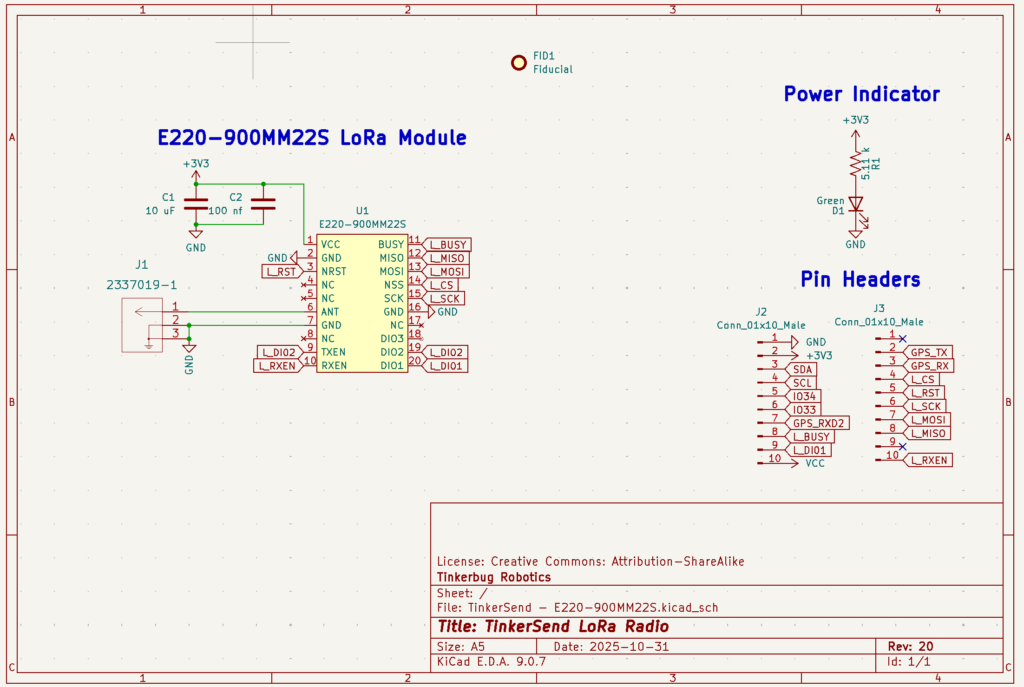 The schematic below shows the electrical connections on the TinkerSend – Lora module. TinkerSend includes the SX1262 module, an SMA connector for the LoRa antenna, decoupling capacitors, and headers. The headers connect to TinkerNav for power, SPI communication, plus two additional GPIOs for DIO1 and RESET. The other header connections are not connected.